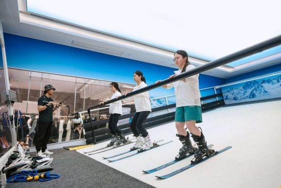 7月8日,参加“春蕾茁壮公益计划”研学营的春蕾女孩们在福建晋江安踏集团品牌中心体验室内滑雪运动项目。