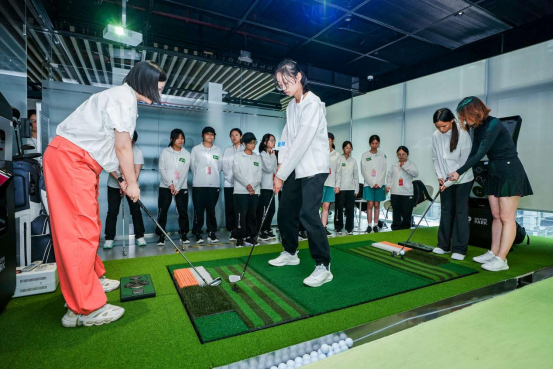 7月7日,参加“春蕾茁壮公益计划”研学营的春蕾女孩们在运动实践环节中参与体验室内高尔夫球。