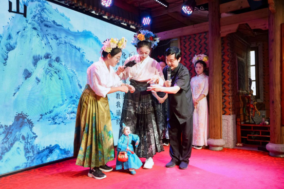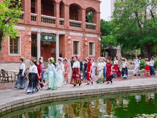 7月8日,参加“春蕾茁壮公益计划”研学营的春蕾女孩们身着蟳蜅女传统服饰,头戴“簪花围”,在晋江市五店市传统街区游览,感受闽南文化魅力。