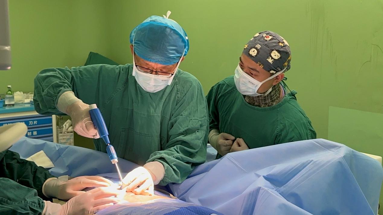 手术当天,樊碧发教授与主任医师毛鹏、主治医师张毅等团队成员紧密协作,在C形臂透视引导下精确定位,确认腰L4/5椎板间隙,于后正中线左侧旁开一微小切口。在局部麻醉下,经硬膜外导管注射非离子造影剂进行硬膜外造影,使用一次性使用腰椎管狭窄微创术减压套件建立工作通道,清理部分黄韧带、脂肪组织。减压完成后,观察到手术部位无明显渗血、周围空间充裕。术程约30分钟,患者全程处于清醒状态,并可与樊碧发教授进行交流。