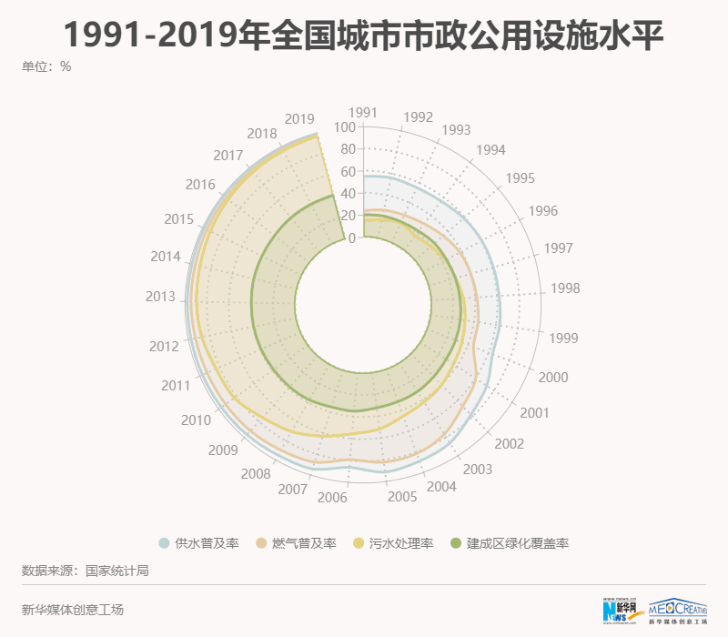 自1991年到2019年城市供水普及率、燃气普及率、污水处理率、建成区绿化覆盖率分别从54.8% 、23.7% 、14.86% 、20.10%提升至98.78%、97.29%、96.81% 、41.51%。城镇化的发展更加细化可见,人们对城市的发展也更加具体可感。