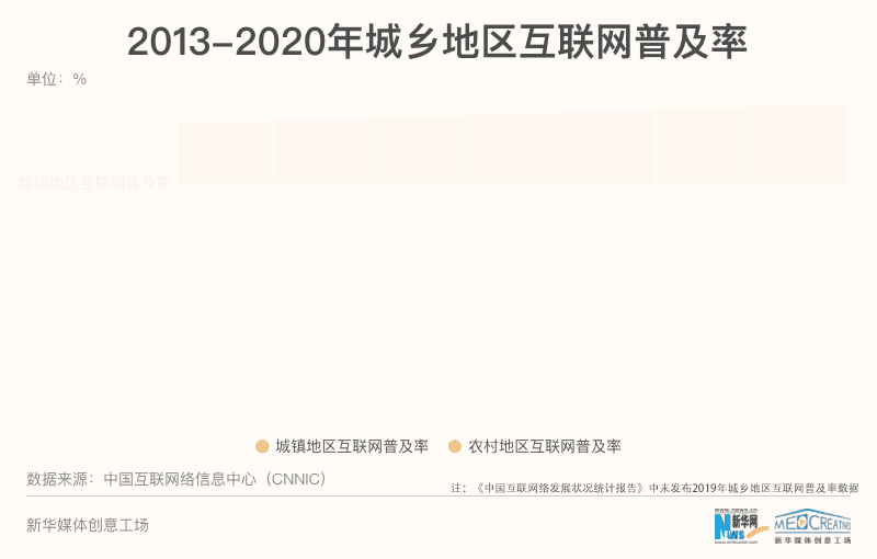 截至2020年12月,中国城镇地区互联网普及率为79.8%,农村地区互联网普及率为55.9%,中国数字乡村建设和网络扶贫工作成效显著,数字鸿沟不断缩小。中国互联网的发展促进了农业转型升级,推动了农民创业就业,也丰富了农民生活。