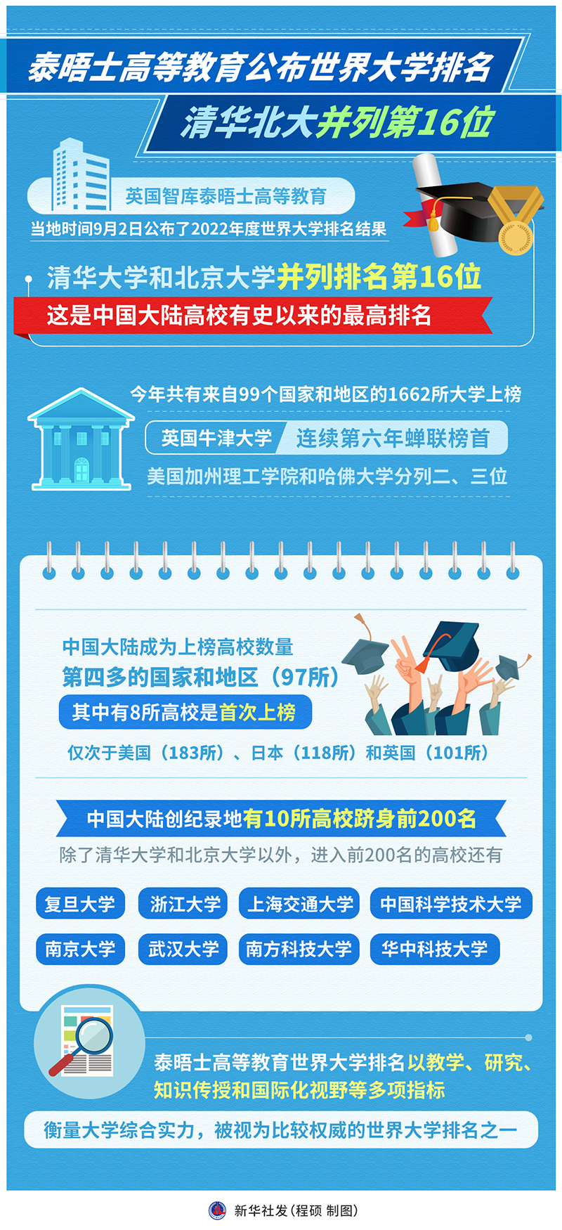 编辑: 马璐璐 设计: 马璐璐 2021年09月14日 10:52:26 来源: 新华网英国智库泰晤士高等教育近日公布了2022年度世界大学排名结果,清华大学和北京大学并列排名第16位,这是中国大陆高校有史以来的最高排名。