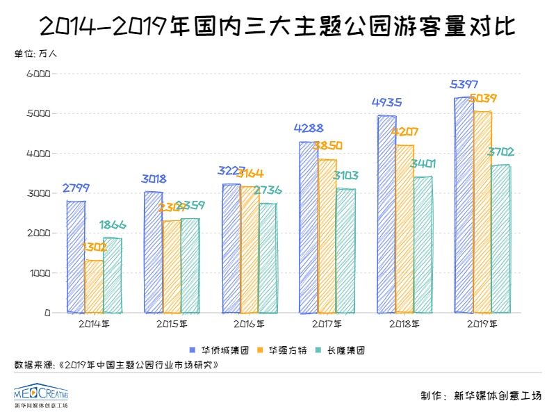 2014-2019年间,华侨城集团、华强方特、长隆集团这三大集团游客量都在稳定增长,其中华侨城集团年游客量稳居第一;华强方特的增速最为明显,较2018年同期相比,2019年游客增速达到19.8%。