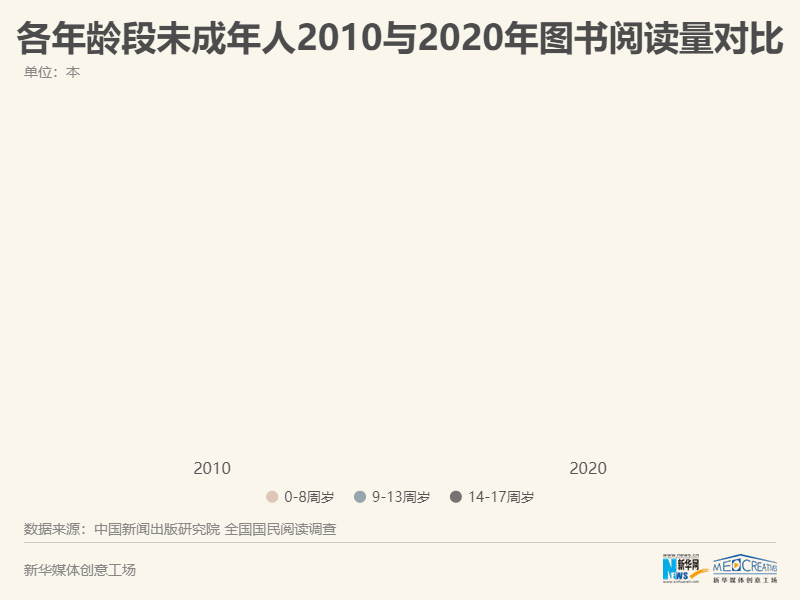 与十年前的数据相比,我国各年龄段未成年人图书阅读量都有非常明显的提升。其中0-8周岁儿童阅读量提升最大,从4.78本上升至10.02本,十年间数量翻了两番多。