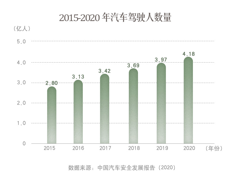 尽管中国驾驶人数量持续攀升,但增幅在放缓,从近几年数据来看,每年新增驾驶人数量由2015年的3613万人开始逐年减少,总体呈下降态势。