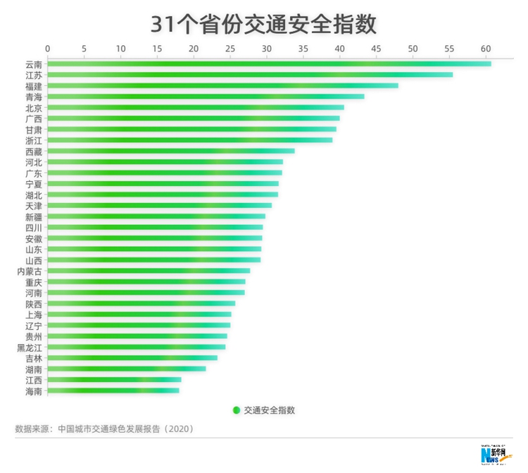 根据中国城市交通绿色发展报告(2020)发布的31个省份交通安全指数,可以看出,交通安全指数平均值由高到低的区域依次为东部地区、西部地区、中部地区、东北地区。其中东部地区和西部地区的交通安全指数平均值高于31个省份交通安全指数平均值(32.04),且差距较小,其余两个地区的交通安全指数平均值均低于此平均值。东部地区交通发达,交通安全行政处罚数较多,而西部地区面积较大,人口较少,交通不发达,因此,涉及的交通安全问题不多。相对来说,东部地区交通安全法规数、交通安全专利数和交通安全行政处罚数较多,西部地区的相关数量较少。