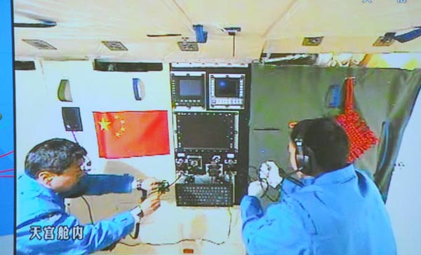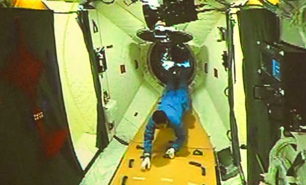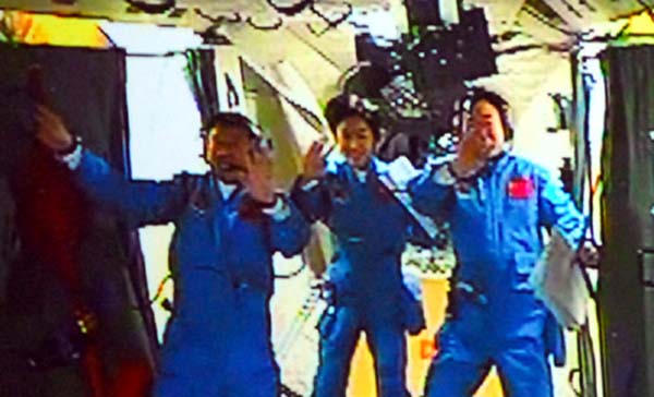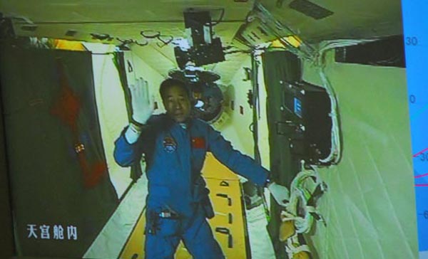 航天员进入天宫一号目标飞行器后向镜头挥手