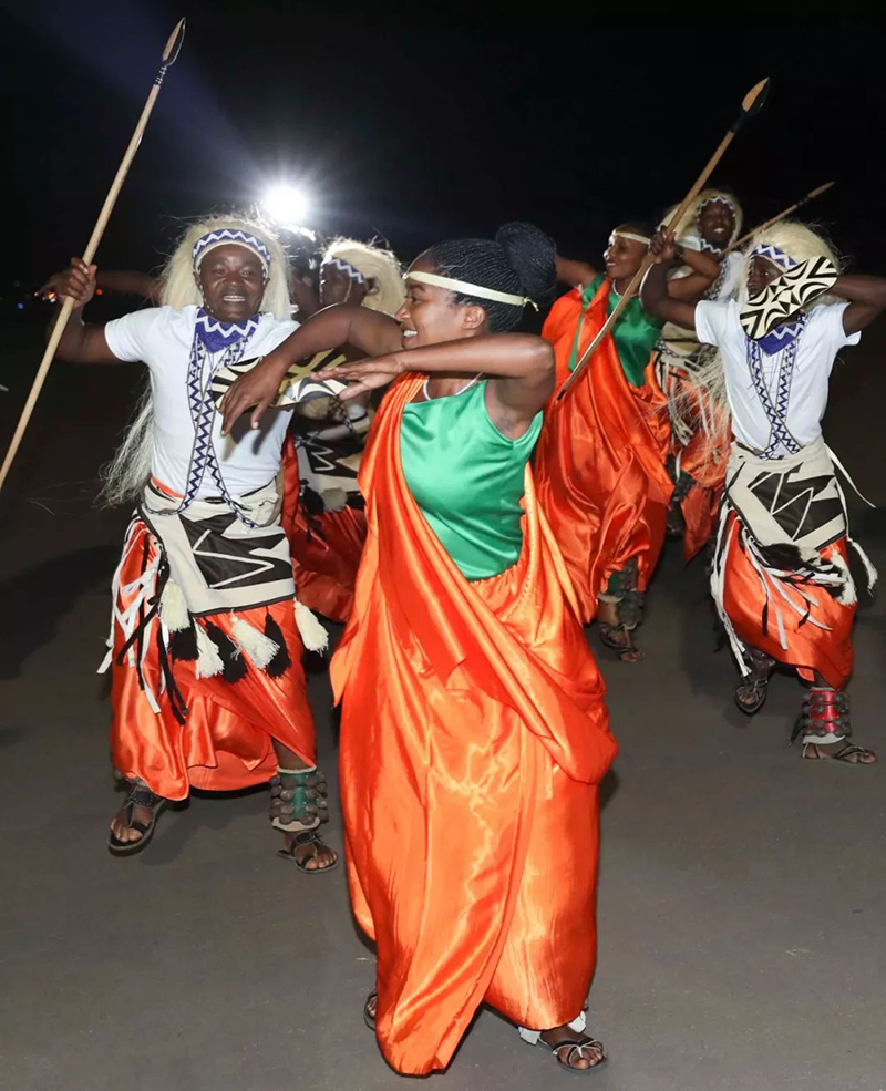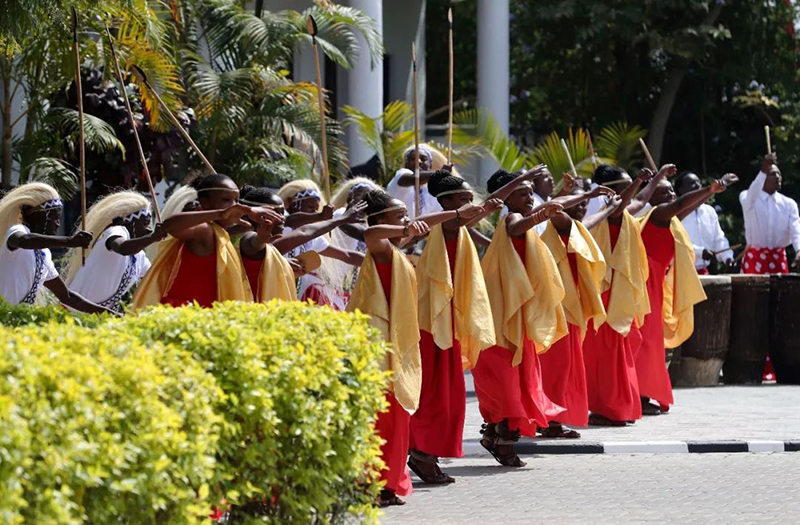 盛装礼兵英姿挺拔,向尊贵的客人行注目礼。鼓声响起,卢旺达民众身着靓丽民族服装,跳起热情的迎宾舞,时而舒展柔缓,时而刚健有力。两国元首驻足观看,挥手致意。