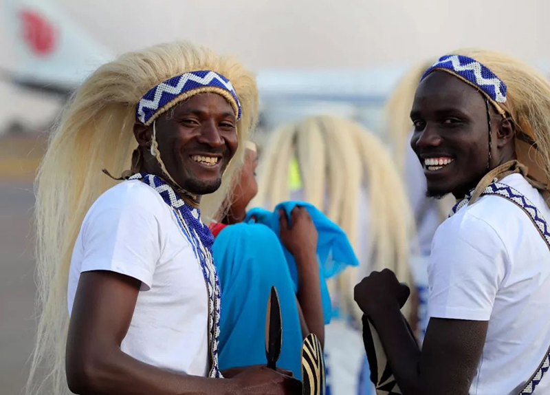 在机场举行的欢送仪式上,身着民族服装的卢旺达民众。新华社记者 庞兴雷摄
