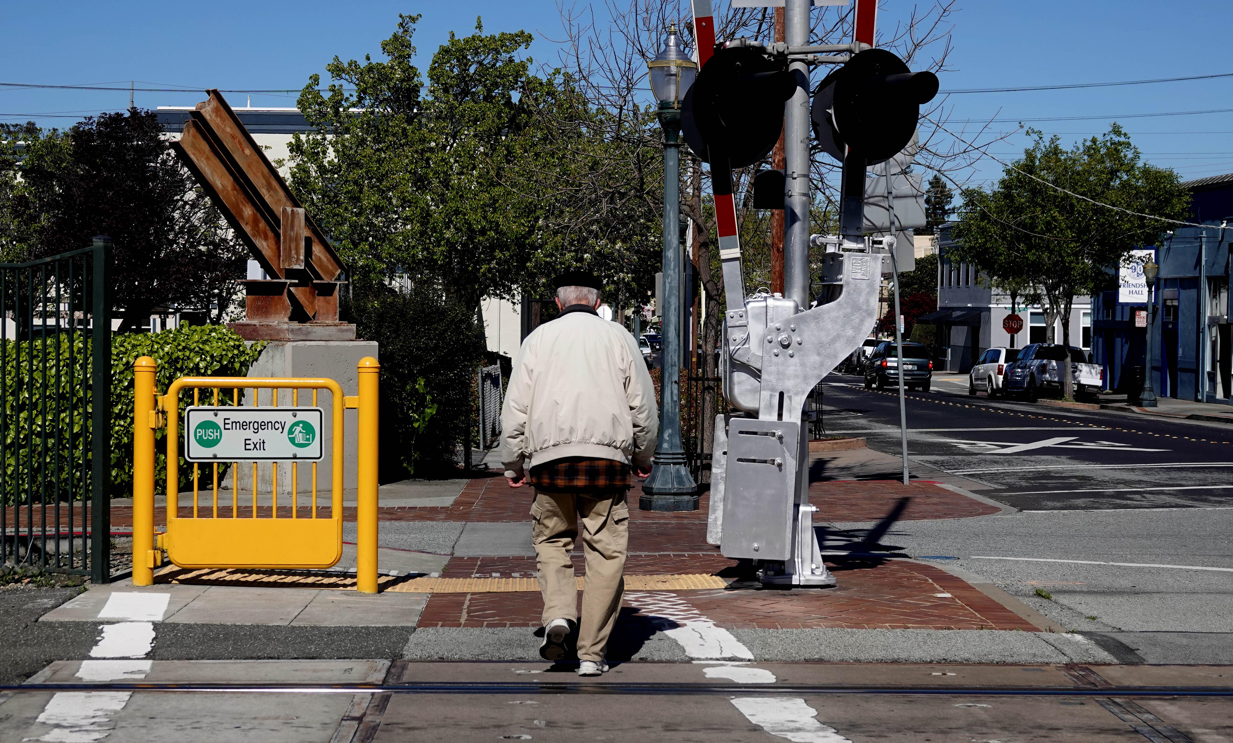 4月2日,在美国加州旧金山湾区圣马特奥市,一名老人横穿铁路。新华社记者吴晓凌摄