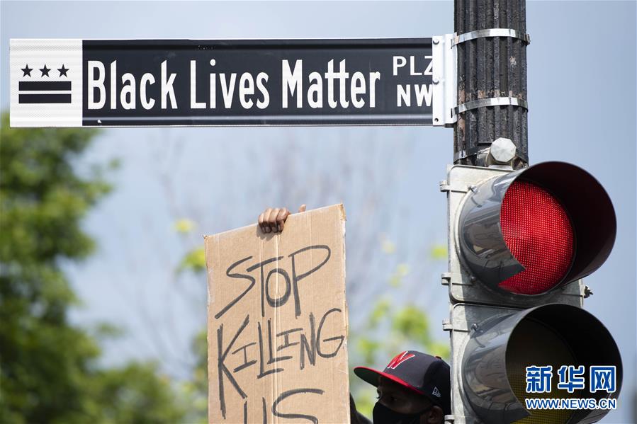 6月6日,一名男子手举“停止杀害我们”的标语在美国华盛顿白宫附近的“黑人的命也是命广场”路牌下参加游行活动。 新华社记者 刘杰 摄