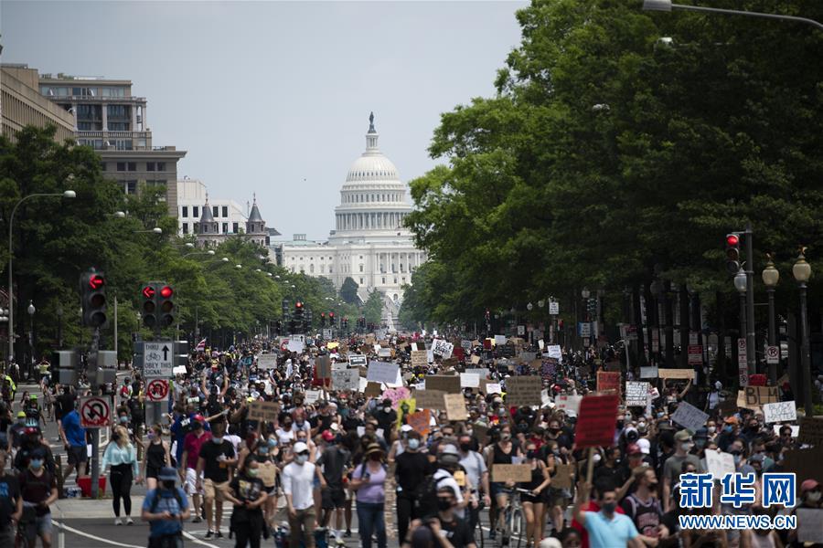 6月6日,人们在美国华盛顿国会附近游行。美国首都迎来了十几天来参与人数最多的游行活动。新华社记者 刘杰 摄