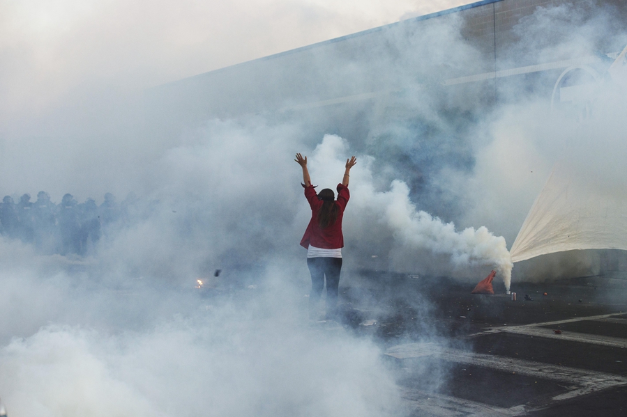 5月30日晚,在美国明尼苏达州明尼阿波利斯市,抗议者在防暴警察施放的催泪瓦斯中与警察对峙。新华社发(安格斯·亚历山大摄)