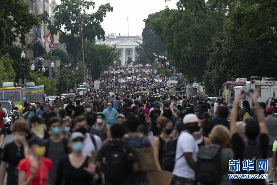 6月6日,人们在美国华盛顿白宫附近游行。美国首都迎来了十几天来参与人数最多的游行活动。新华社记者 刘杰 摄