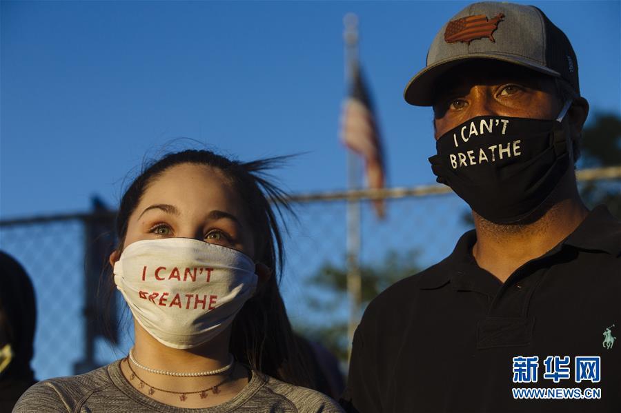 5月30日晚,在美国明尼苏达州明尼阿波利斯市,抗议者面戴写有“我无法呼吸”的口罩,参加抗议活动。新华社发(安格斯·亚历山大摄)