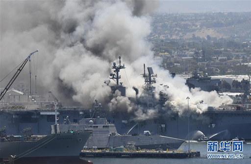7月12日,美国加利福尼亚州圣迭戈海军基地起火冒出浓烟。 停泊在加利福尼亚州圣迭戈海军基地的一艘美军两栖攻击舰12日发生火灾。新华社/美联