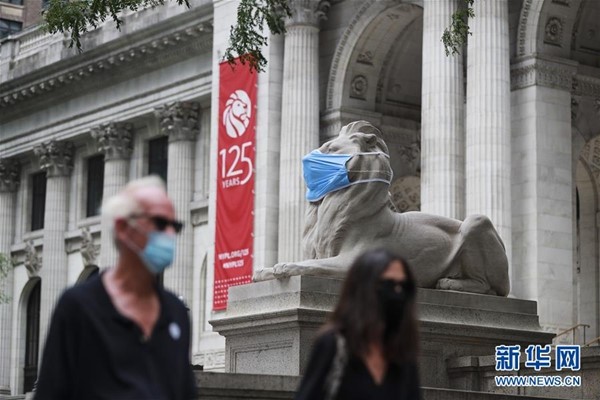 这是7月8日在美国纽约公共图书馆前拍摄的“戴”口罩的石狮子。 新华社记者 王迎 摄