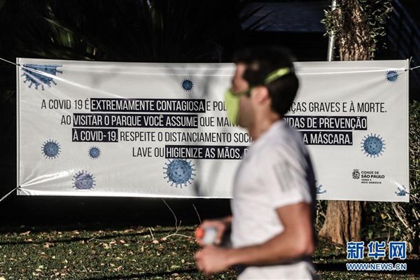 7月13日,在巴西圣保罗市重新开放的伊比拉普埃拉公园内,一名男子经过提醒游客做好防护的条幅。 新华社发(拉赫尔·帕特拉索摄)