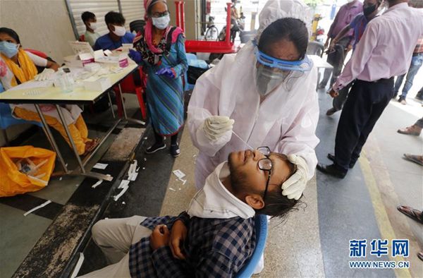 7月14日,医务人员在印度艾哈迈达巴德为居民进行新冠病毒检测取样。 新华社发