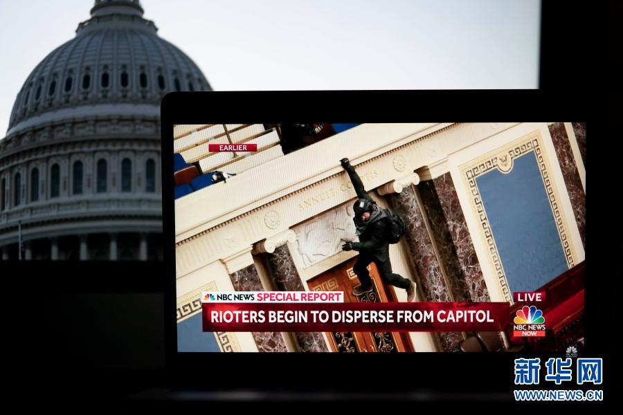 1月6日拍摄的电视画面显示,一名抗议者闯入位于美国华盛顿的国会大厦。新华社记者 刘杰 摄