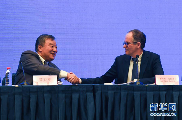 2月9日,联合专家组中方组长梁万年(左)和联合专家组外方组长彼得·本·安巴雷克握手。当日,中国—世界卫生组织新冠病毒溯源研究联合专家组在武汉举行新闻发布会,通报共同开展新冠病毒全球溯源中国部分的工作情况。新华社记者 程敏 摄