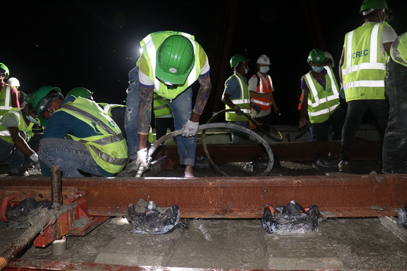 6月19日,中国中铁孟加拉国帕德玛大桥铁路连接线项目中,工人进行无砟轨道混凝土振捣作业。(项目方供图)