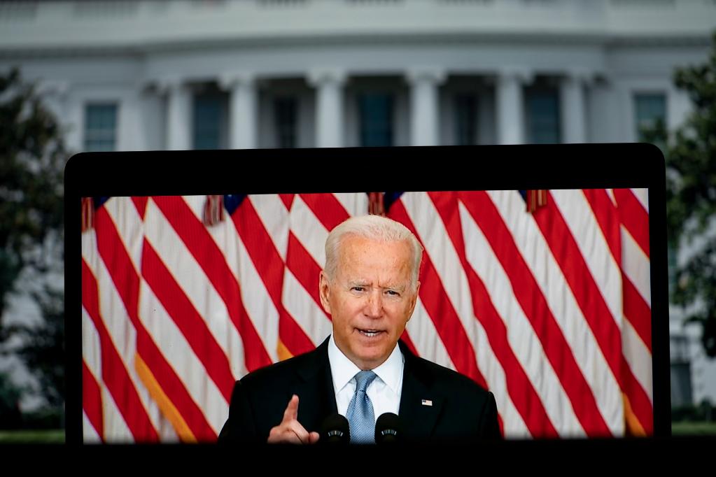 8月16日拍摄的电子屏幕显示,美国总统拜登在华盛顿白宫就阿富汗局势发表讲话。拜登强调美军撤出阿富汗是正确决定,但他承认阿局势恶化快于美方预期。(新华社记者刘杰摄)