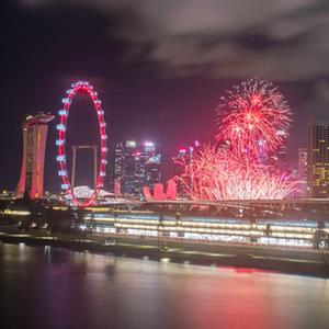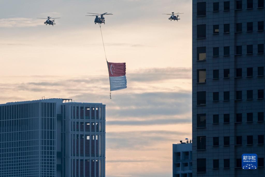 8月21日,直升机在新加坡滨海湾上空进行飞行表演。受新冠疫情影响,新加坡以往8月9日举行的国庆庆典推迟到21日举行。新华社发 (邓智炜摄)