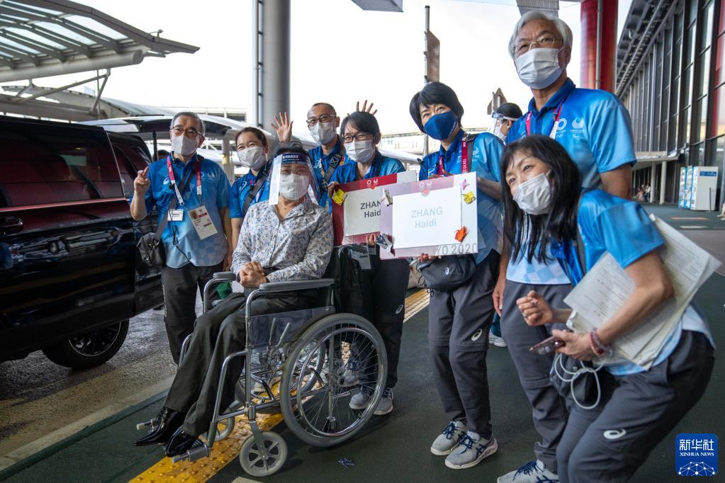 8月22日,第16届残奥会中国体育代表团团长、中国残联主席、中国残奥委员会主席张海迪(左三)抵达东京成田机场后与志愿者合影。