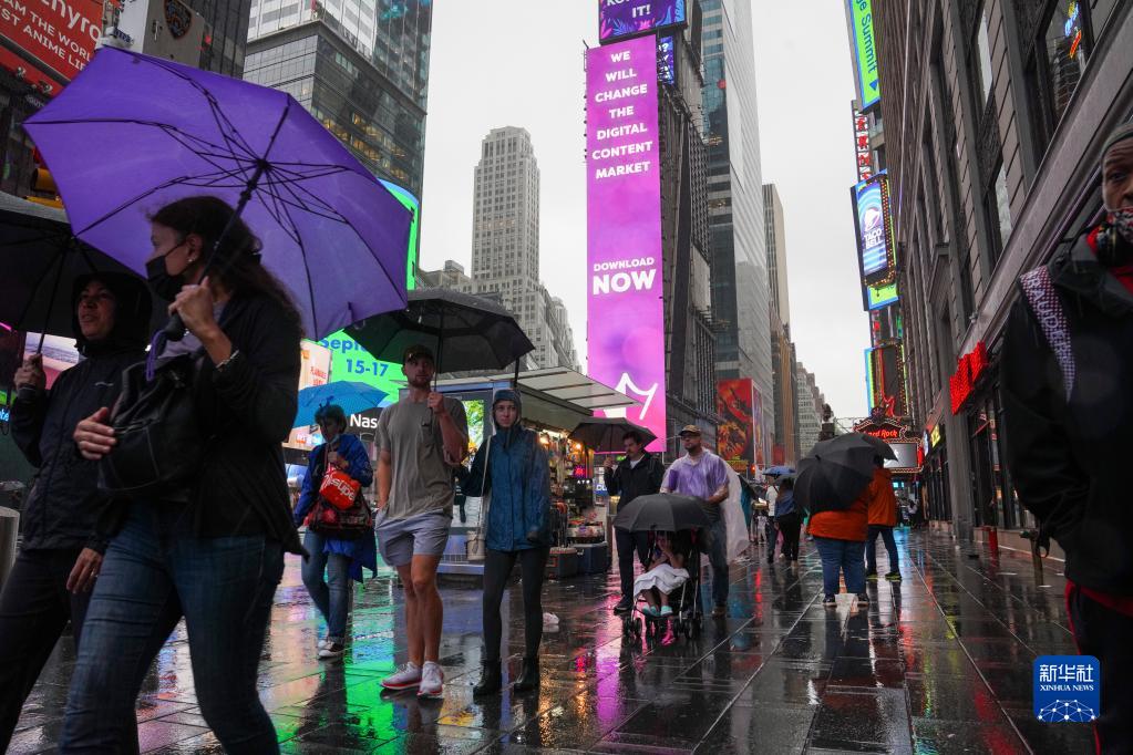 8月22日,人们行走在雨中的美国纽约时报广场上。受热带风暴“亨利”影响,美国纽约当日迎来降雨天气。新华社记者 王迎 摄