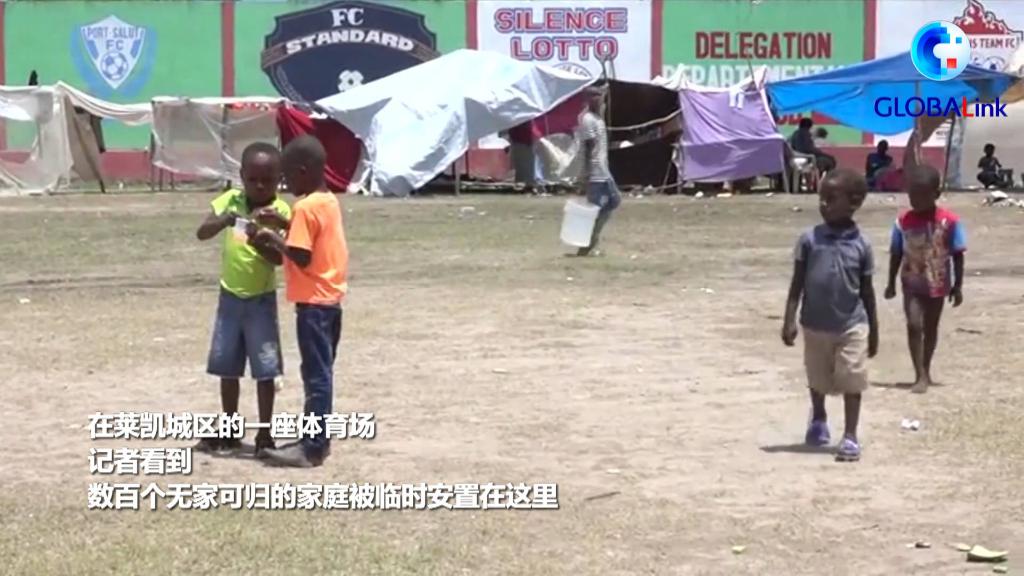 在莱凯城区的一座体育场,记者看到,数百个无家可归的家庭被临时安置在这里。