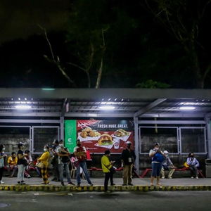 8月23日,人们佩戴口罩在菲律宾奎松城等车。