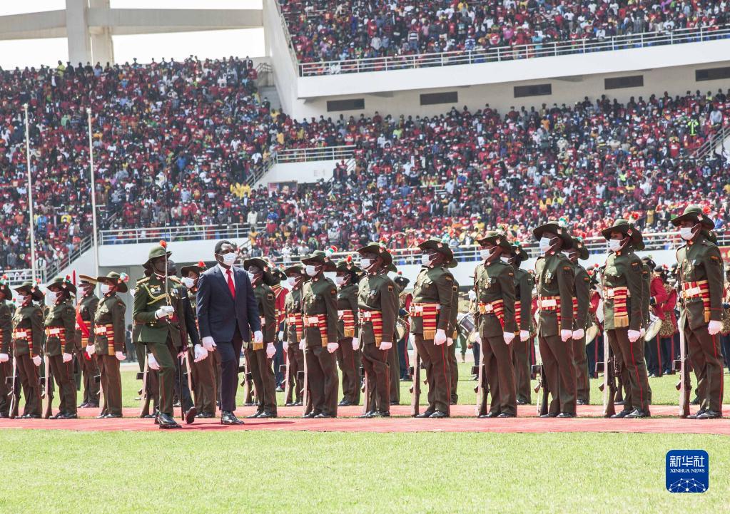 8月24日,哈凯恩德·希奇莱马在赞比亚首都卢萨卡举行的就职仪式上检阅仪仗队。新华社发(马丁·姆班圭塔摄)