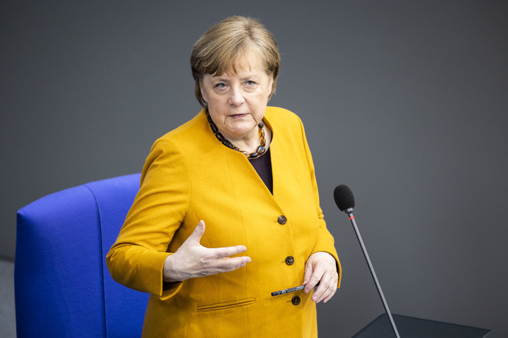 3月24日,德国总理默克尔在位于柏林的德国联邦议会接受问询。新华社发(弗洛里安·格特纳摄)