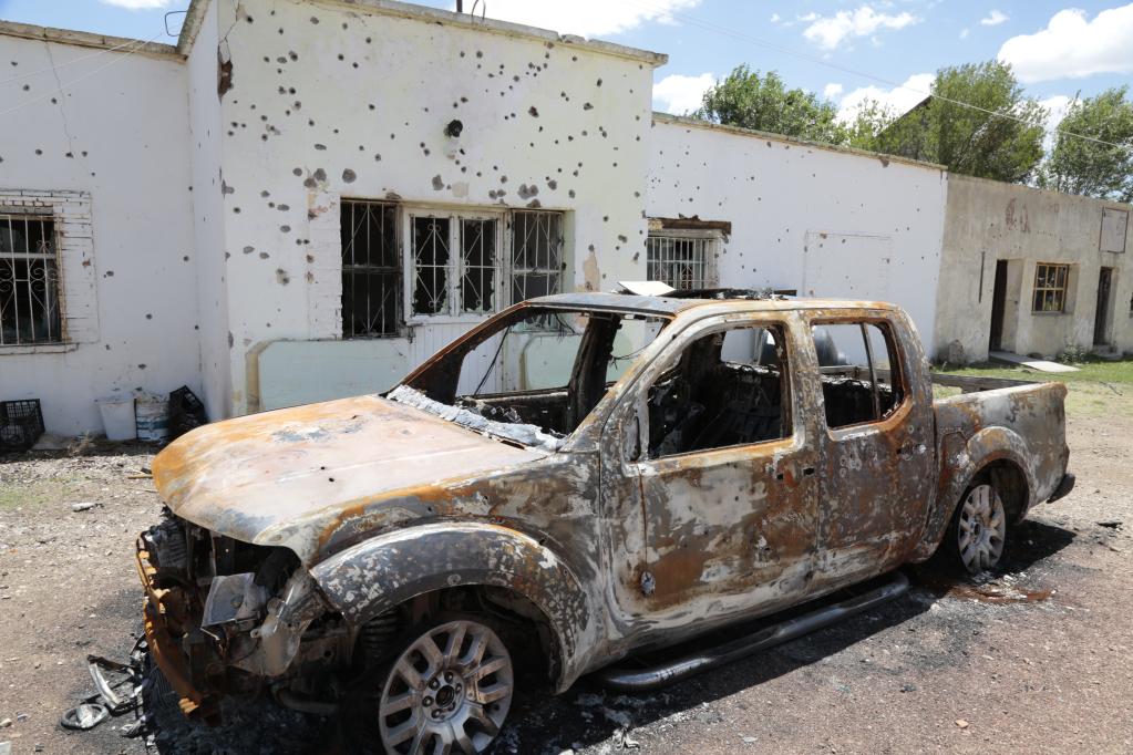 2017年7月6日,在墨西哥奇瓦瓦州拉斯巴拉斯拍摄的一辆在当地警方与犯罪团伙交火中被损毁的车辆。(新华社发,佩纳多摄)