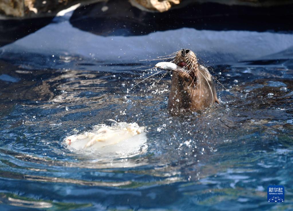 8月26日,一只海狮在意大利罗马动物园享用冰冻食物。