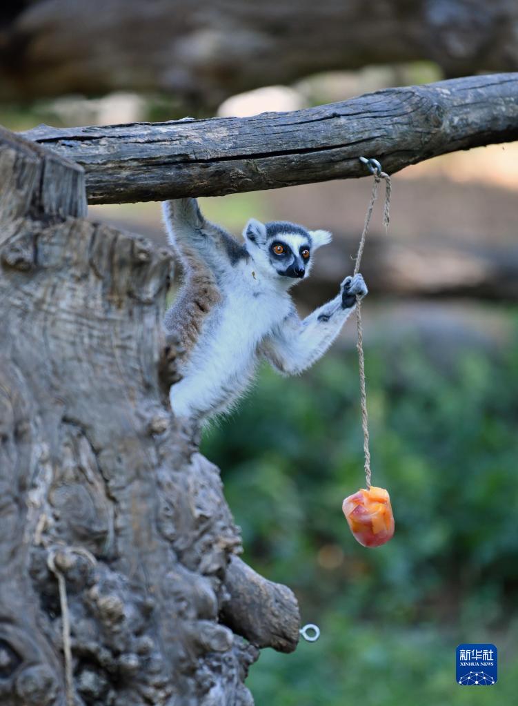 8月26日,一只环尾狐猴在意大利罗马动物园准备享用冰冻果蔬。
