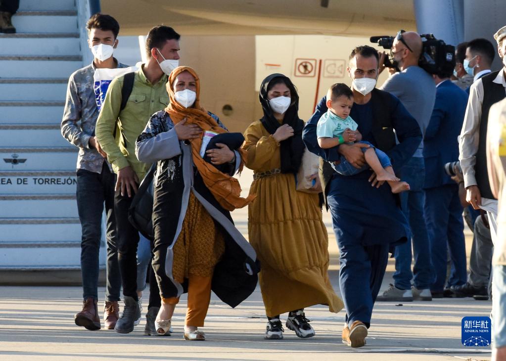 8月27日,从阿富汗撤离人员抵达西班牙首都马德里附近的托雷洪-德阿尔多斯空军基地。新华社发(古斯塔沃·巴连特摄)