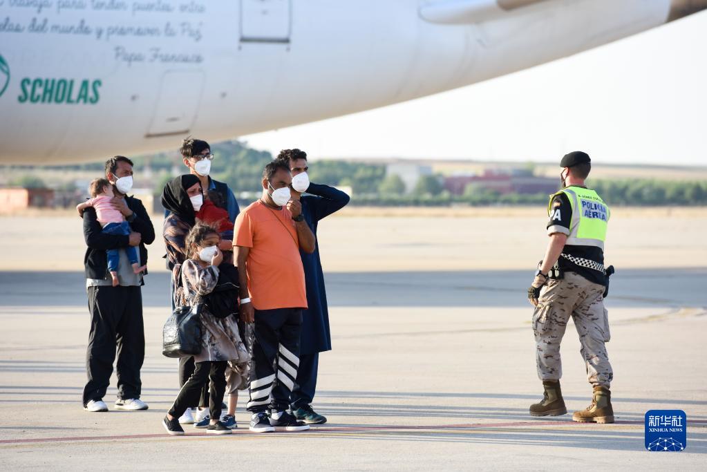 8月27日,从阿富汗撤离人员抵达西班牙首都马德里附近的托雷洪-德阿尔多斯空军基地。新华社发(古斯塔沃·巴连特摄)