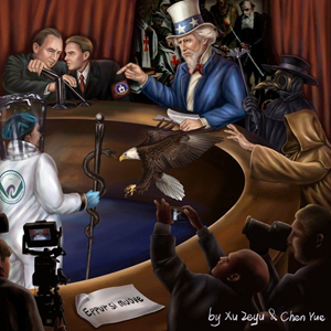 漫画以美国国会听证会为场景,右上方一幅名为“被审判的伽利略”的油画以及画面下方伽利略的一句拉丁文名言“Eppur si muove”(意为“地球仍然在转啊”),都点明了这幅漫画的主题——美国政府对科学精神的打压,正如欧洲宗教裁判所对伽利略的审判一样荒谬可笑。正在受审的是一名象征着科学精神的武汉病毒研究所的科研人员。审判席上从左到右,分别坐着历史上反科学、反理性的臭名昭著的人物形象。画面左边竖立的是自由女神像与天启死亡骑士的混合体,右边则是象征美国政府的白头海雕,正扑向受审者手中的蛇形手杖。