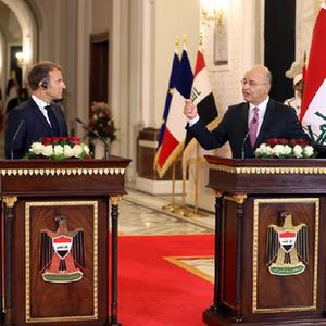 8月28日,在伊拉克首都巴格达,伊拉克总统巴尔哈姆(右)同法国总统马克龙出席新闻发布会。新华社发(哈利勒·达伍德 摄)