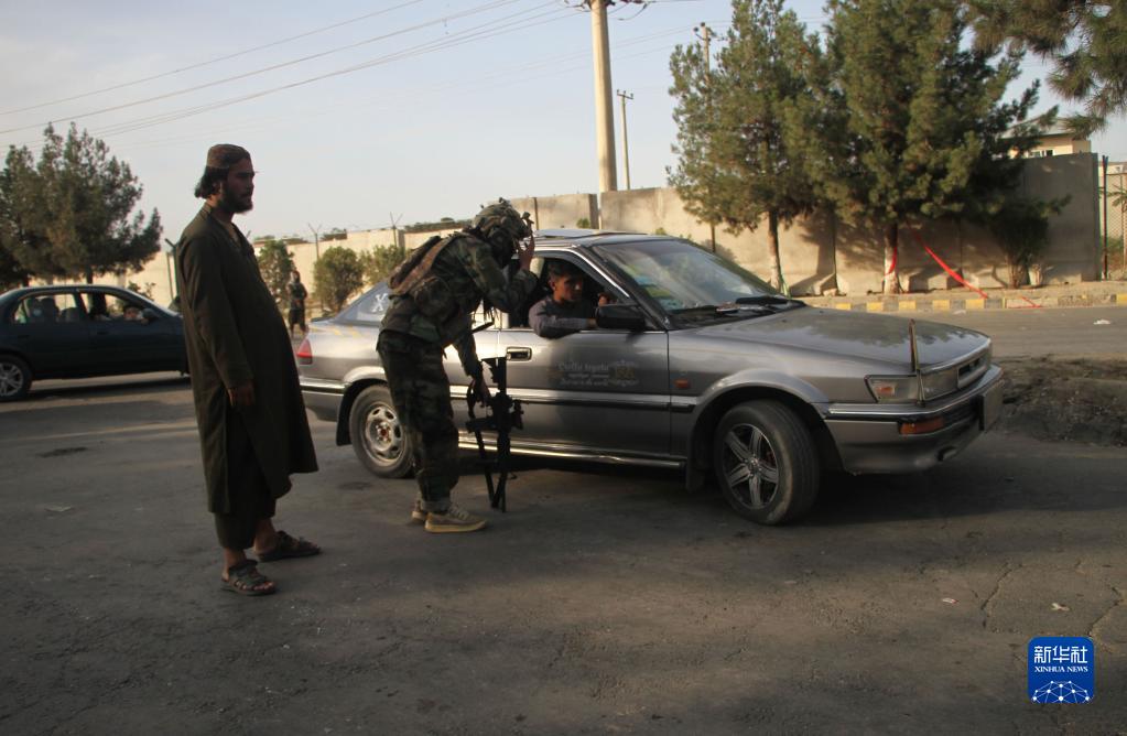 8月28日,阿富汗塔利班人员在喀布尔街头检查车辆。