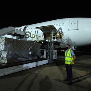 8月28日,工作人员在古巴哈瓦那机场卸载中国政府紧急援助的抗疫物资。