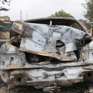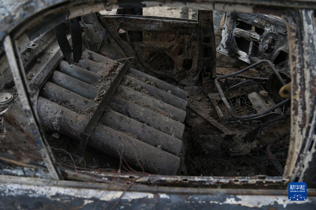 这是8月30日在阿富汗喀布尔拍摄的一辆毁坏的汽车,这辆汽车内部装有火箭弹发射装置,当日发射火箭弹后被毁。