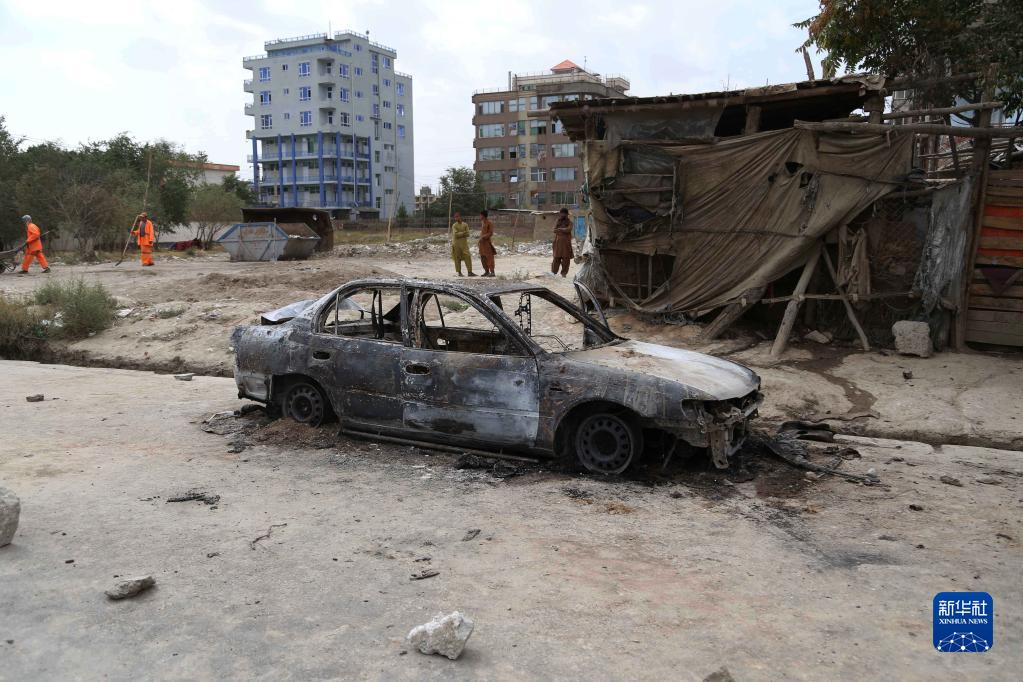 这是8月30日在阿富汗喀布尔拍摄的一辆毁坏的汽车,这辆汽车内部装有火箭弹发射装置,当日发射火箭弹后被毁。