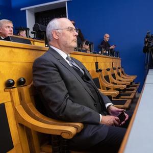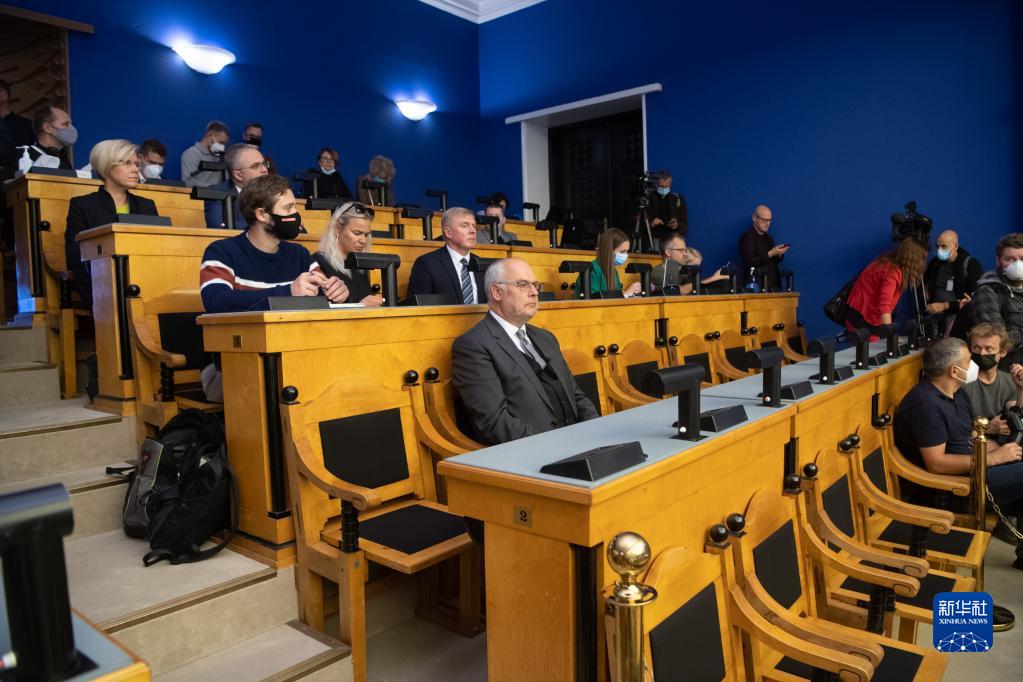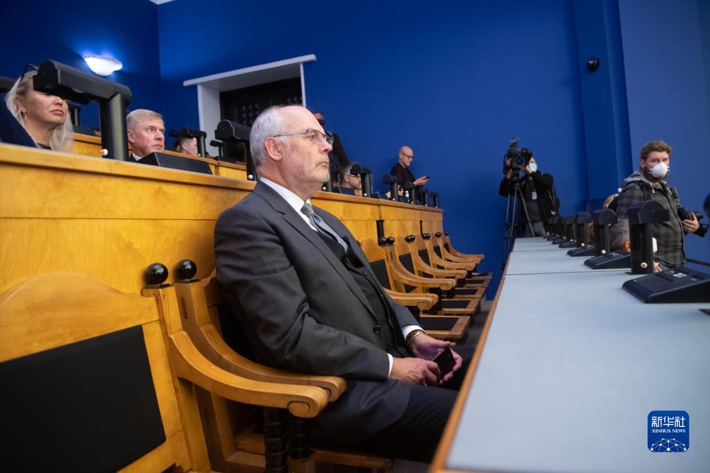 8月30日,在爱沙尼亚首都塔林,总统候选人阿拉尔·卡里斯(中)在议会出席总统选举首轮投票。新华社发(爱沙尼亚议会供图)