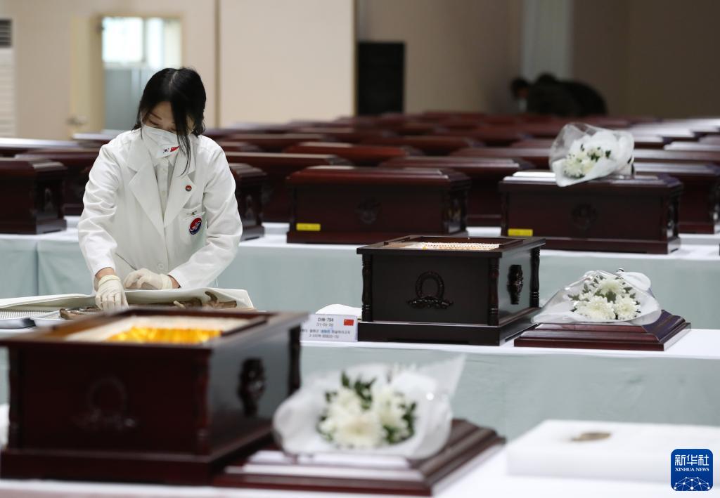 9月1日,在韩国仁川,韩方工作人员将志愿军烈士遗骸入殓。