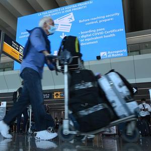 9月1日,意大利罗马菲乌米奇诺机场提示牌提示旅客进入安检前准备好“绿色通行证”。