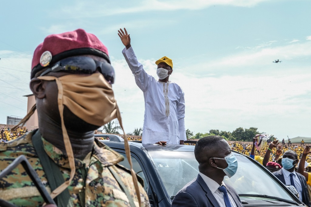 2020年10月16日拍摄的几内亚现任总统孔戴在首都科纳克里出席竞选活动的照片。(新华社发,埃迪·皮特斯摄)